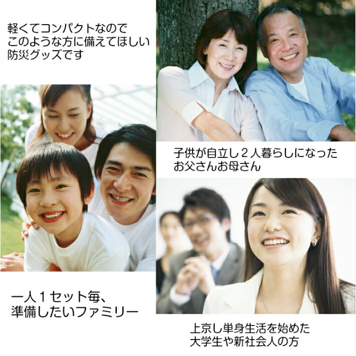 •コストは抑えながら、比較的身近で入手しにくい防災アイテムを多くセレクト!主に単身者、会社での常備用にオススメ!ファミリーも人数分用意することで十分対応します。